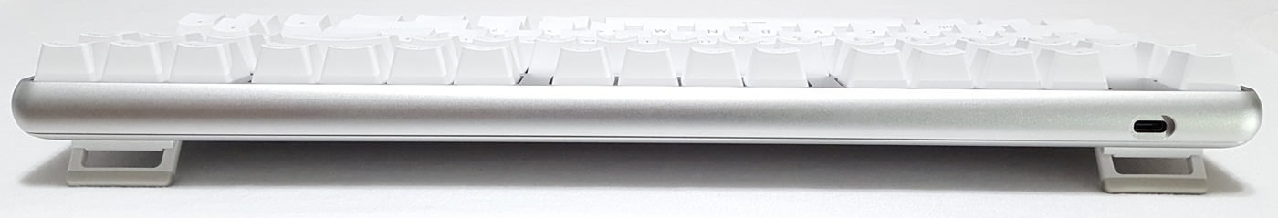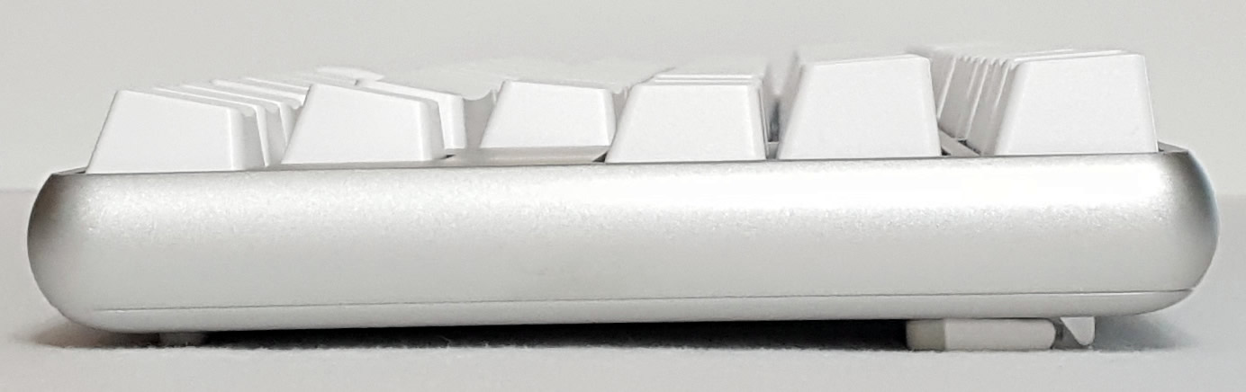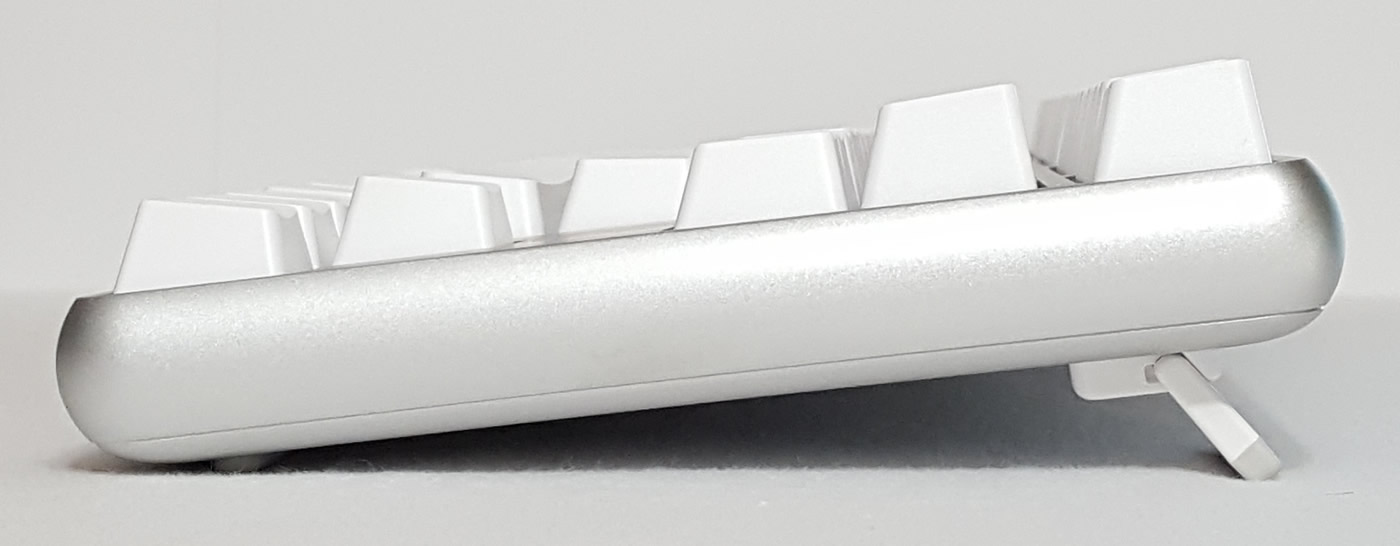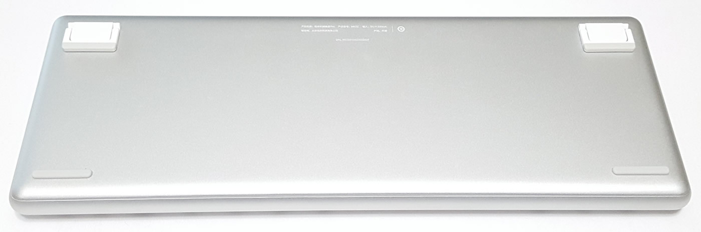 Located on the bottom plate of the aluminum case are 2 rubber feet and 2 flip-out feet that provide height adjustment. The flip-out feet are rubber tipped, but the rubber layer is very thin and harder than you would typically expect to find. This hard rubber material is closer to plastic in feel and has less grip, so the keyboard does tend to be a little more susceptible to sliding and unwanted movement than most keyboards with rubber tipped feet.