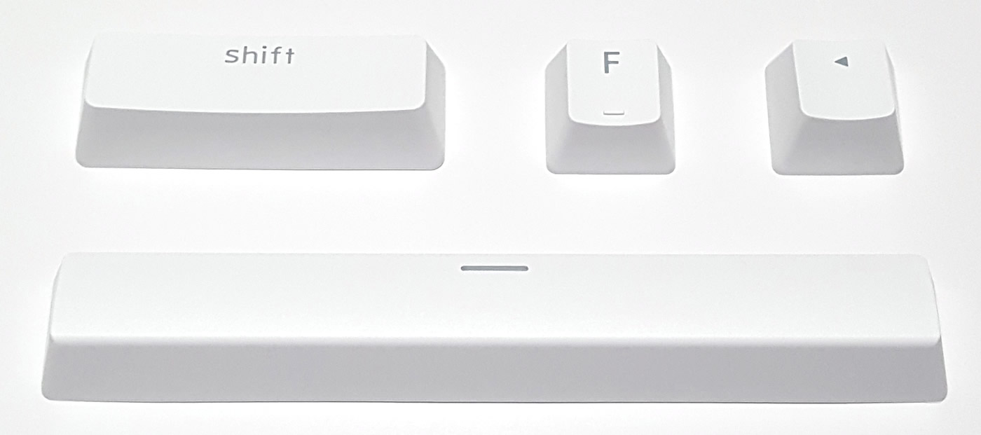 The keycaps have a light matte texture and make use of small homing bumps on the F and J key. The keycaps are also pretty thin, though the thickness does vary as it increases along with the size of the keycap. For example, when checking with a caliper the small 1u keycaps measure only 1mm thick, the right Shift about 1.2mm and the spacebar is the thickest at roughly 1.4mm. That’s all basically in line with the keycaps on the previous model.