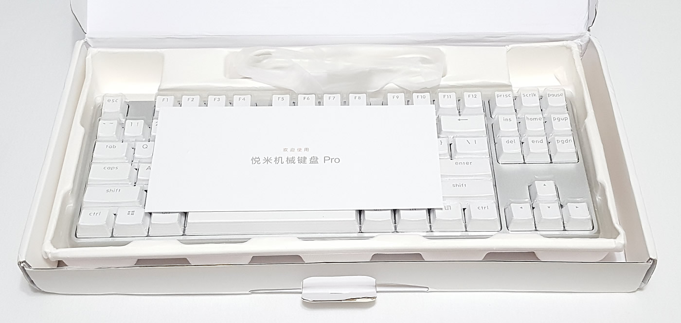 Inside the XiaoMi Yuemi Pro MK02 and included accessories are held securely in place and protected by a rigid tray. This stops the keyboard from moving around during transit and helps keep it safe from potential drops and crushing.